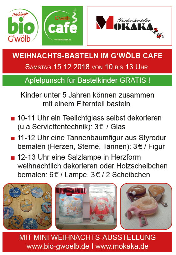 Am Samstag den 15.12.2018 von 10-13 Uhr gibt es beim BIO G’wölb am Kirchplatz in Oberhaching bei leckerem Apfelpunch Besteleinheiten für Klein und groß. Wir freuen uns auf Sie!